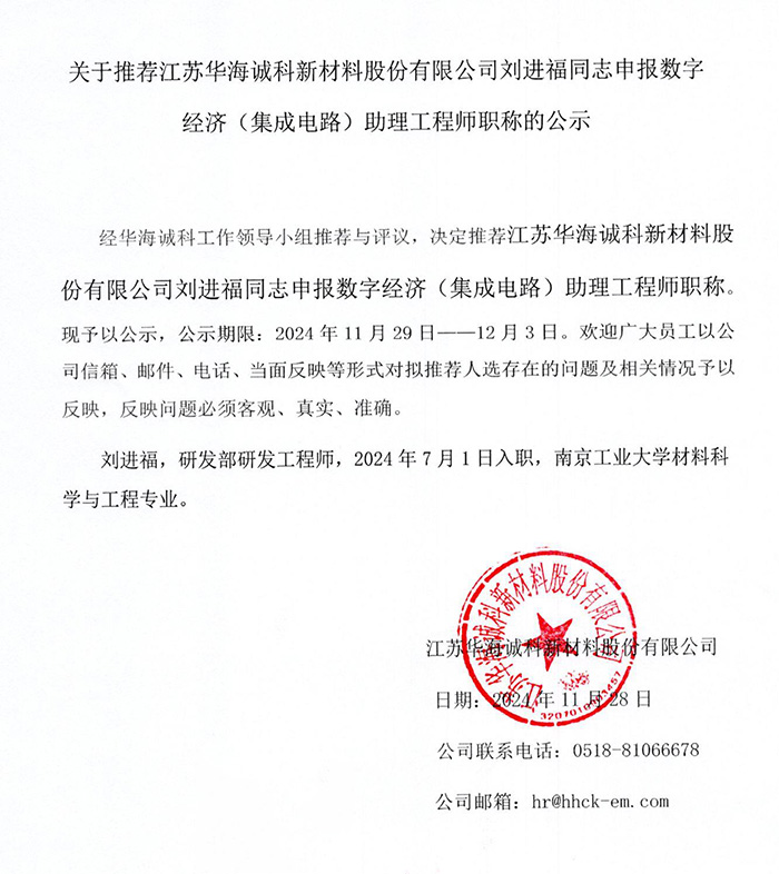 關于推薦江蘇華海誠科新材料股份有限公司劉進福同志申報數(shù)字經(jīng)濟(集成電路)助理工程師職稱的公示
